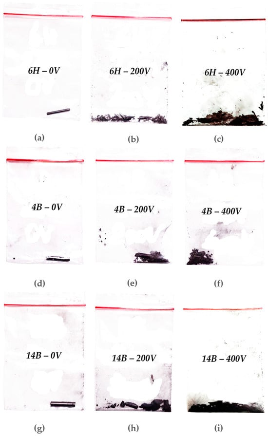 Changes in the physical appearance of the samples at different voltages: (a) 6H pencil at 0 V, (b) 6H pencil at 200 V, (c) 6H pencil at 400 V, (d) 4B pencil at 0 V, (e) 4B pencil at 200 V, (f) 4B pencil at 400 V, (g) 14B pencil at 0 V, (h) 14B pencil at 200 V, and (i) 14B pencil at 400 V.