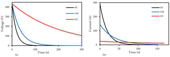 Capacitor discharge (a) voltage concerning time and (b) current concerning time decay through each pencil grade during the FJH process.