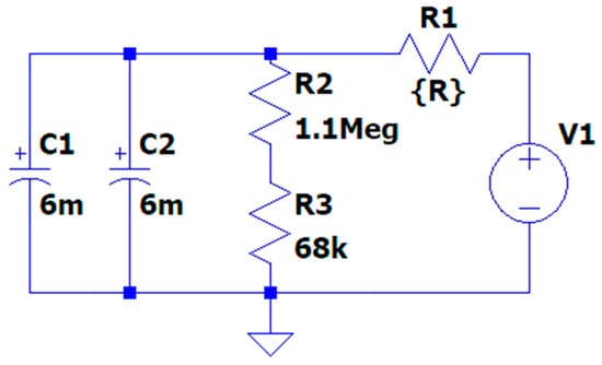 These results suggest that pencils with lower resistance, such as 4B and 14B, are more suitable for graphene production via FJH. Their ability to allow higher current flow and rapid energy dissipation likely contributes to more efficient heating and graphene formation. To better understand these results, we modeled the FJH setup using the circuit shown in Figure 7. This simplified circuit includes two 6 mF or 6000 μF capacitors (C1 and C2) representing the capacitor bank, fixed resistors R2 (1.1 MΩ) and R3 (68 kΩ), and a variable resistor R1 representing the pencil lead. The resistance values for R1 were set to 1.5 ohms for 4B, 3 ohms for 14B, and 17.5 ohms for 6H, based on our measurements of the actual pencil leads used in the experiments. This simulation provides valuable insights into the electrical behavior of different pencil grades under FJH conditions, helping to predict their effectiveness in the graphene production process.