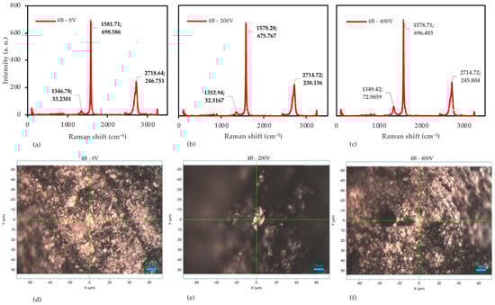 The microscopic image for the 4B–400 V sample reveals significant morphological changes, including higher levels of aggregation and structural reorganization. This visual evidence corroborates the Raman data, indicating the introduction of defects at higher voltages and resulting in a more irregular surface morphology.