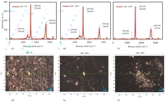 Building upon our analyses of 6H and 4B pencil leads, we now turn our attention to the 14B samples, which represent the softest grade in our study. Figure 10 presents the combined Raman spectroscopy and microscopic analysis for 14B samples subjected to voltages of 0 V, 200 V, and 400 V, revealing intriguing structural changes that differ significantly from the harder pencil grades.