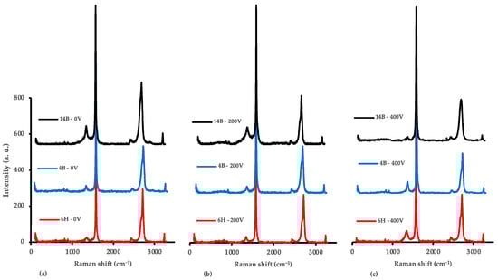 Raman spectroscopy comparison of the 6H, 4B, and 14B pencil samples at 0 V, 200 V, and 400 V. (a) Raman spectra comparison at 0 V. (b) Raman spectra comparison at 200 V. (c) Raman spectra comparison at 400 V.