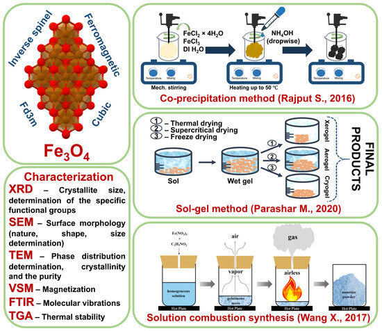 The main methods for the preparation of magnetite nanoparticles include coprecipitation, sol–gel, and solution combustion [89,90,91]. Coprecipitation is one of the most common and inexpensive methods, in which magnetite is precipitated from aqueous solutions of iron salts by changing the pH. This method is simple and inexpensive, but often results in particle size inhomogeneity and requires careful control of the reaction conditions to achieve the desired performance. The sol–gel method is based on the hydrolysis and condensation of precursors to form a sol, which is then gelled and dried to produce magnetite nanoparticles. This method produces particles with a high degree of homogeneity and controlled size but is time and resource consuming. Solution combustion is a method in which rapid combustion of organic substances in a metal ion-containing solution, resulting in the formation of magnetite nanoparticles. This method is characterized by high speed and low cost but can lead to agglomeration and requires optimized conditions to produce stable and homogeneous particles.