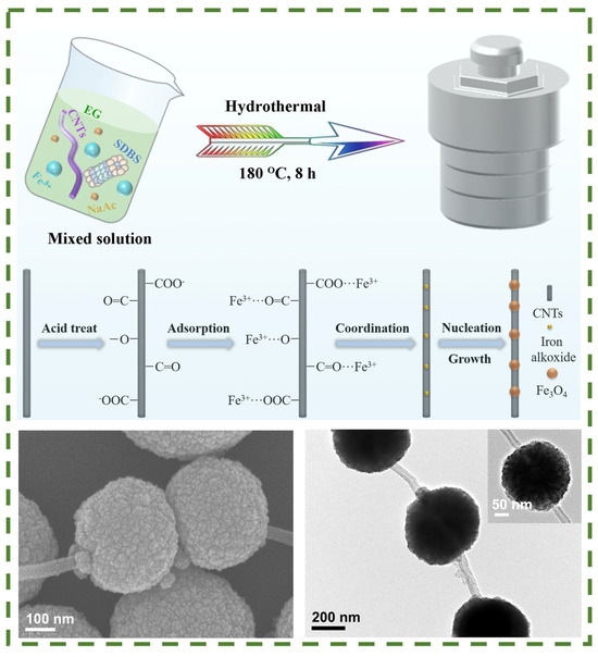 For example, Xuzhen Wang et al. [104] used an in situ solvothermal method to synthesize Fe3O4/CNT nanocomposites, which resulted in nanocomposites with a uniform distribution of quasi-spherical magnetite nanoparticles of size 10–25 nm on the outer surface of CNT due to the control of the initial mass ratio of ferrocene to CNT and the reaction temperature. It is worth noting that the choice of solvent and temperature profile critically affects the composite structure, such that reaction at 500 °C in benzene leads to the formation of small and uniform nanoparticles, whereas reaction in acetone or ethanol leads to the formation of Fe3O4 microparticles and carbon dendritic structures.