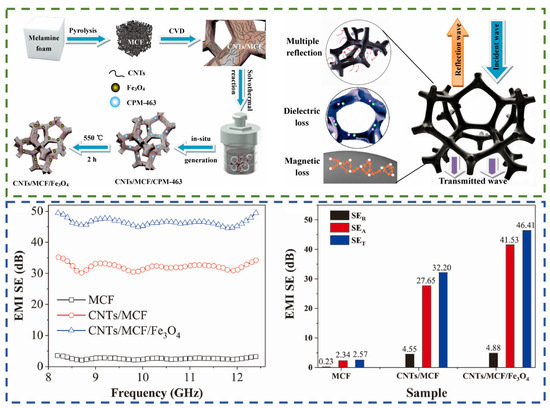 Schematic illustration of the CNT/MCF/Fe3O4 composite preparation method and its EMI shielding mechanism. The EMI shielding property values of MCF, CNTs/MCF, and CNT/MCF/Fe3O4 [117].