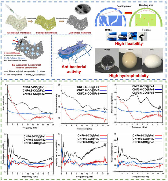 On the other hand, a recent study [128] combined nanomembranes containing cobalt and iron, which exhibited high microwave absorption efficiency and significant antibacterial and water—repellent properties (Figure 13). Among the samples studied, the CNFs 0.6-Co@Fe3 composite exhibited the most favorable performance, with a minimum reflection of −29.10 dB at a thickness of 1.5 mm in the frequency range of 15–20 GHz. This phenomenon can be attributed to the rise in the concentration of nanoparticles within the matrix, which results in an enhancement of the complex dielectric permittivity and magnetic permeability of the composites. It is crucial to highlight that the augmentation in PVA content exerts a constructive influence on the RL performance, which is attributable to the elevation in solution viscosity and enhanced conductivity.