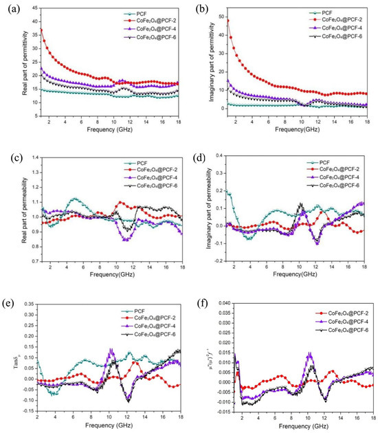 Frequency dependence of ε′ (a), ε″ (b), μ′ (c), μ″ (d), and tanδμ (e) of PCF and CoFe2O4@PCF nanocomposites, and C0 of CoFe2O4@PCF nanocomposites (f) [130].
