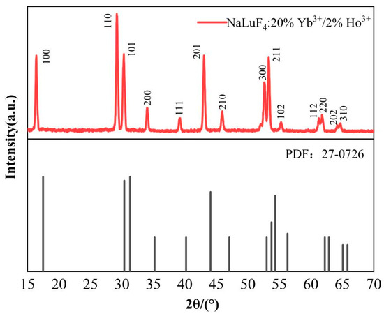 Figure 1 shows the XRD pattern of the NaLuF4:20%Yb3+/2%Ho3+ micron-sized crystals. As shown in the characterisation diagram, the diffraction positions of the sample coincided with each peak of the standard card (PDF #27-0726). The diffraction peaks were sharp, no other diffraction peaks were observed, and the crystal quality of the sample was satisfactory. Notably, we prepared Yb3+/Ho3+-co-doped NaLuF4 micron-sized crystal particles with hexagonal phases. The data presented in Figure 1 show that the diffraction peaks of the samples shifted noticeably towards smaller angles. This is because the ionic radii of Ho3+ (0.089 nm) and Yb3+ (0.086 nm) were larger than that of Lu3+ (0.085 nm). When the Ho3+ and Yb3+ ions replaced the Lu3+ ions, lattice expansion resulted in a shift in the diffraction peaks towards smaller angles.