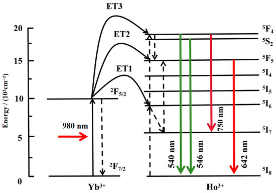 The energy exchange process between the rare-earth ions, Yb3+ and Ho3+, was explored (Figure 5). The 980 nm radiation stimulated Ho3+ and Yb3+ through ground state absorption (GSA). Because the absorption cross-section of Ho3+ ions was restricted, the GSA process was significantly weak against Ho3+, and the absorption cross-section of Yb3+ at a wavelength of 980 nm was approximately an order of magnitude greater than that of Ho3+. In this material, the concentration of Yb3+ was 10 times that of Ho3+, and most incident photons were absorbed by the Yb3+ ions, which transferred energy to the Ho3+ ions through an energy-transfer mechanism.