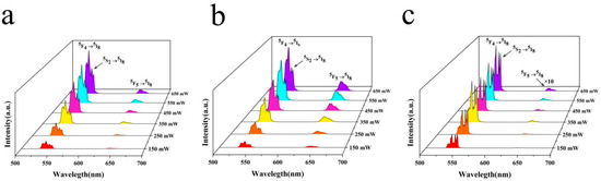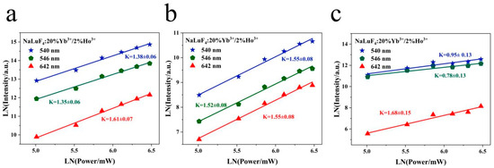 To better clarify the process behind the UC luminescence, we studied the relationship between the green and red luminescence intensities of Ho3+ under different excitation powers. Figure 6a–c shows the UC spectra of fluorescent Yb3+/Ho3+-co-doped NaLuF4 materials under different 980 nm laser power density excitations at temperatures of 303, 483, and 4 K. The red emission spectrum was magnified by a factor of ten at 4 K to facilitate the observation of trends. The data depicted in Figure 6 illustrate that under 980 nm laser excitation at 303, 483, or 4 K, the UC luminescence intensity of the sample gradually increased as the excitation power was increased from 150 to 650 mW, whereas the shape of the spectrum and the wavelength corresponding to the peak value did not change or shift significantly. The UC spectrum of the sample mainly included the following two emission bands: The green emission resulted from the 5F4/5S2→5I8 transition, with a wavelength range of 520–570 nm and a consuming emission signal corresponding to peak wavelengths of 540 and 546 nm. The red emission produced by the 5F5→5I8 transition corresponded to a wavelength range of 620–660 nm, and the emission signal was weak, corresponding to a peak wavelength of 642 nm.