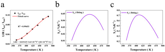 where C, D, E, and F are constants; I540 and I642 are integral intensities; and T denotes the absolute temperature. The fitting results of LIR are shown in Figure 10a. The experimental data fit this line well, and the deviation R2 = 0.99653. The spectrum shows that the luminescence intensity at 540 nm decreased significantly with increasing temperature, whereas the luminescence intensity at 642 nm gradually decreased. The difference in the response of the non-thermally coupled levels to temperature is conducive to obtaining a higher temperature sensitivity. Sa and Sr are also crucial metrics for evaluating temperature sensors [11].