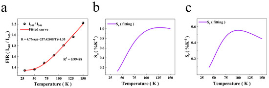 the fitting results of FIR at low temperatures are shown in Figure 11a. The FIR increased with temperature, and R2 in Figure 11a is 0.99488, indicating a very high fit correlation. The Sa and Sr of the 540 and 546 nm thermally coupled energy levels at low temperatures were calculated using Equations (9) and (10). Sa and Sr increased significantly at low temperatures. The overall trend exhibited an initial ascent followed by a subsequent descent. The maximum value of Sa was 1.02% K−1 at 125 K, and that of Sr were 0.55% K−1 at 100 K, respectively. This shows that the sample has better temperature sensing performance at low temperatures. The energy gap value at low temperatures is 178.8 cm−1, which is similar to that reported in the literature, 180 cm−1. A comparison of previously reported results with the research results of this work (as shown in Table 2) reveals that Yb3+/Ho3+-co-doped NaLuF4 based on thermally coupled energy levels is an excellent temperature sensing material.