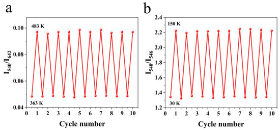 (a) Temperature cycling measurement of NaLuF4:Yb3+/Ho3+ between 363 K and 483 K; (b) Temperature cycling measurement of NaLuF4:Yb3+/Ho3+ between 30 and 150 K.