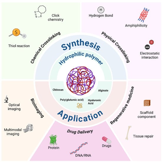 While the simultaneous approach is widely adopted, NGs can alternatively be synthesized through two sequential steps: polymerization and crosslinking. This sequential approach offers enhanced control over NG properties and functionalities, a topic that will be explored further in subsequent sections. In terms of post-polymerization crosslinking, NGs are categorized into chemically crosslinked or physically self-assembled types; the first type relies on covalent bonds among different polymers, while the second relies on non-covalent interactions among them. However, many NGs incorporate both chemical and physical connections in their formation. Thus, this section will elaborate on these interactions and showcase examples of NGs created through these mechanisms. In Table 2, we schematically compare the advantages and disadvantages of the two types of syntheses, which will be discussed in more detail below. These different synthesis techniques provide versatile tools for tailoring NGs with specific properties, making them highly adaptable for applications in drug delivery, diagnostics, and tissue engineering within the biomedical field.
