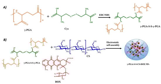 Schematic illustration of the synthesis of a nanogel (NG) using electrostatic self-assembly. (A) Polyglutamic acid (PGA) is covalently modified with cystine (Cys) to obtain a pH/redox-responsive NG. (B) The modified PGA is mixed with doxorubicin (DOX) and chitosan (CS) in an aqueous environment to formulate NGs by electrostatic self-assembly. Reprinted with permission from Ref. [26].