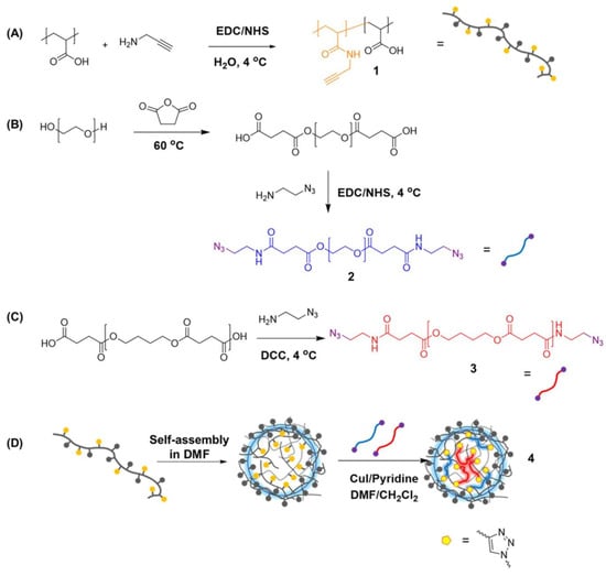 Illustration of the synthetic route for the preparation of random amphiphilic copolymers using poly(acrylic acid) (PAA) modified with alkyne groups (A) and their macromolecular crosslinkers poly(ethylene glycol) (PEG) (B) and poly(butylene succinate) (PBS) (C) modified with azides. Amphiphilic NGs (D) were created by hydrophobicity-driven self-assembly of the copolymers (A) and subsequent crosslinking with a mixture of hydrophilic (B) and hydrophobic (C) crosslinkers, resulting in amphiphilic NGs with biodegradable and/or water-soluble crosslinkers. Reprinted with permission from Ref. [35].
