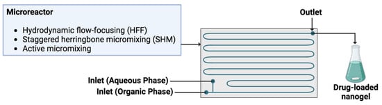 Microfluidic synthesis of NGs has demonstrated significant improvements in control and efficiency [20,80,84,85,86]. E.g., Bazban Shotorbani et al. [87] synthesized alginate NGs via ionic gelation using hydrodynamic flow-focusing microchips, achieving precise size control and monodispersity. Mahmoudi et al. [88] fine-tuned the flow rate ratio on microchips to form alginate NGs, while Huang et al. [89] created hyaluronic acid NGs via photo-click crosslinking on a microchip platform. Majedi et al. [90] utilized modified chitosan on a T-shaped microfluidic chip, and Chiesa et al. [91] formed chitosan/sodium triphosphate (TPP) NGs using a staggered herringbone micromixer.