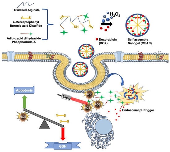 Schematic illustration of the multi-stimuli-responsive alginate nanogel (MSAN) for chemo-photodynamic therapy. Using a skeleton of oxidated alginate conjugated with 4-mercaptophenyl boronic acid and Pheophorbide-a (photosensitizing agent), the nanogels were formed by self-assembly in the presence of hydrogen peroxide (H2O2) and doxorubicin (DOX). The image also shows the mechanism of action within a cell with particle degradation triggered by acidic pH conditions and/or assisted by phototherapy. ROS: reactive oxygen species; GSH: glutathione. Reprinted with permission from Ref. [110].