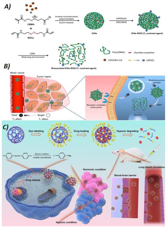 (A) Scheme for the preparation of poly(carboxybetaine methacrylate) (CBMA) nanogels (NGs) crosslinked with N,N-bis(acryloyl)cystamine(BACy), loaded with extremely small iron oxide nanoparticles (ESIONP), and modified on the surface with c(RGD) ligands, which bound αvβ3 integrins, overexpressed on the membrane of some tumor cells. These NGs (ICNs-RGD) act as activatable MRI contrast agents with a switchable function, from a T2 contrast agent to a T1 one, through the stimuli-responsiveness toward GSH. (B) Depiction of the utilization of ICNs-RGD to realize a precise tumor diagnosis based on the transformation from the T2 to T1 contrasting effect at the tumor region. (C) Schematic illustration of the poly(phosphorylcholine)-based (HPMPC) NGs, which have long blood circulation, blood–brain barrier (BBB) penetration capability, and hypoxic-controlled drug release for glioblastoma drug delivery. In blue: phosphorylcholine polymers; in orange: azobenzene-containing crosslinker (molecule shown on the left); in yellow: Cy5 dye with a linker; in red: doxorubicin. Panels A and B reprinted from Ref. [125] with permission from copyright © 2020, American Chemical Society. Panel C reprinted with permission from Ref. [119].