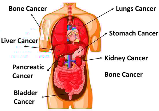 Cancer encompasses a diverse group of diseases, with prevalent types receiving global attention including but not limited to brain, breast, kidney, melanoma, and liver cancers as mentioned in Figure 1. Each type of cancer originates in specific tissues and exhibits unique characteristics, affecting various organs. Understanding these cancer types is crucial for effective diagnosis, treatment, and research efforts to improve outcomes and reduce the global burden of cancer. A comprehensive awareness of and research in these areas contribute to advancements in oncology, fostering better strategies for prevention, early detection, and personalized therapies [].