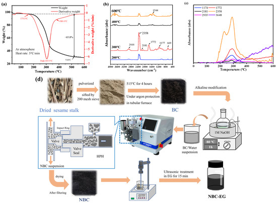 Figure 1. (a) TGA analysis of the biomass, (b) the FTIR spectra of the gasses obtained during pyrolysis at various temperatures, (c) the characteristics of typical functional groups at different temperatures, and (d) the preparation of NBC-EG coolant.