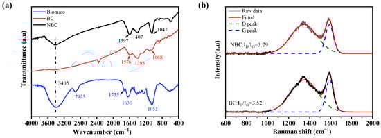 The FTIR spectra of the biomass powder, BC, and NBC are presented in Figure 3a. The peak around 3404 cm−1 corresponds to the stretching vibration of -OH [33]. In the spectra of the biomass powder, the peak of 2923 cm−1 corresponds to the stretching vibration of CHn [34], and the peak at 1735 cm−1 is assigned to the stretching vibration of carboxylic C=O [35], and the peak at 1636 cm−1 stands for the stretching vibration of C=O or C=C in the skeletal structure on the aromatic benzene ring [36]. In the fingerprint region, the peaks at 1376 cm−1 and 1052 cm−1 are ascribed to the bending vibration of CHn [37] and the stretching vibration of C-O [38], respectively. The peaks at 1576, 1395, and 1068 cm−1 in the FTIR spectra of the BC are attributed to the stretching vibrations of C=C on the aromatic ring, the bending vibration of -CHn, and the stretching vibration of C-O, respectively [39]. In the FTIR spectra of the NBC, the peak at 1597 cm−1 reflects the stretching vibration of C=O or C=C on the aromatic ring, while the peaks at 1395 and 1068 cm−1 refer to the bending vibration of -CHn and stretching vibration of C-O, respectively.