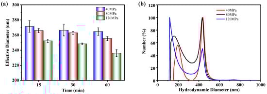The equivalent diameters of the NBC particles at different times and homogenizing pressures are depicted in Figure 5a. The influence of homogenization time on particle size was not obvious under the homogenization pressure at 40 MPa. Under the homogenizing pressure at 80 and 120 MPa, only homogenization time reaching 60 min led to a reduction in the particle size of the NBC. However, the particle size of the NBC reduced with the increasing homogenization pressure under the same homogenization time, indicating the homogenization pressure exerted a more pronounced effect on reducing the equivalent diameter of the NBC compared to the homogenization time. This could be explained by the fact that higher homogenization pressures imply stronger mechanical forces, leading to a reduction in the equivalent diameter of NBC particles [46].