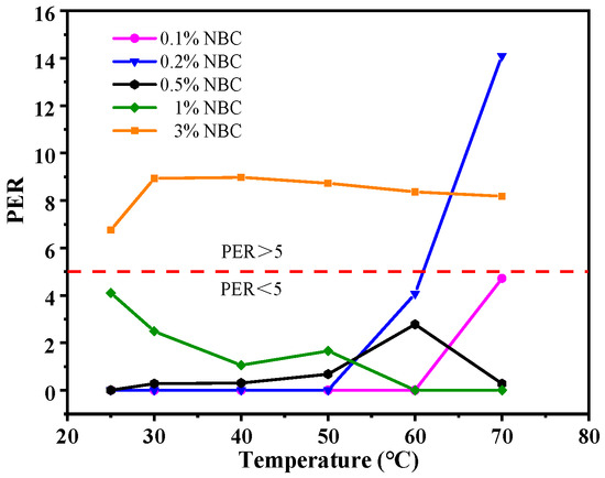 where µnf and µbf are the viscosity of nanofluid and base fluid, respectively. knf and kbf are the thermal conductivity of nanofluid, respectively. The PER values of the nano-biochar coolant at various temperatures are depicted in Figure 9. At a 0.1 wt.% of NBC concentration, the PER of the nanofluid meets the required standards at all temperatures. Upon increasing the concentration to 0.2%, there is a sharp increase in the PER value at 70 °C, primarily due to an increase in viscosity at high temperatures. As the concentration further increases to 0.5% and 1%, the nanofluid still meets the requirements at all temperatures. Yet, when the concentration reaches 3%, the sharp rise in viscosity, without a significant increase in thermal conductivity, results in an average PER value of 8.3 at all temperatures, which is no longer applicable as a coolant. For practical applications, the appropriate concentration of NBC shall be selected on the basis of working condition requirements.