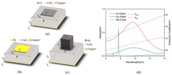 Schematic of metasurface absorbers constructed using three different types of nanoresonators: (a) a Cr patch, with period of p = 1.8 μm, length of patch l = 1.6 μm, thickness of tm = 200 nm, on a dielectric spacer with thickness td = 600 nm and a bottom metal substrate thickness of ts = 100 nm; (b) a Au patch with the same as that in the (a); (c) Ge Cube, with a period of 2.8 μm and length and thicknesses of l = 2.1 μm, ti = 2.1 μm, td = 2.4 μm, ts = 100 nm. (d) Calculated infrared absorption spectra (left axis) of the MSA with a Cr patch, Au patch and Ge cube. The extinction coefficient of Au and Cr are cited from [,] (right axis). Intrinsic Ge is lossless with a negligible extinction coefficient [].