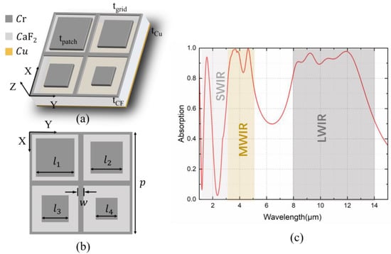 The thickness of the grid and patches are tgrid = 5 nm and tpatch = 15 nm, respectively. The material comprising the dielectric layer is CaF2, with a thickness of tCF = 0.9 μm, and a 100 nm metal copper layer is chosen as the substrate. The width of the Cr grid w is 0.4 μm, and the lengths of the patches are customized as l1 = 3 μm, l2 = 2.5 μm, l3 = 2.1 μm and l4 = 1.7 μm. The period of a unit cell is p = 8 μm. The refractive indices of Cr and CaF2 are referenced from [,]. The complex permittivity of copper is cited from the material library.