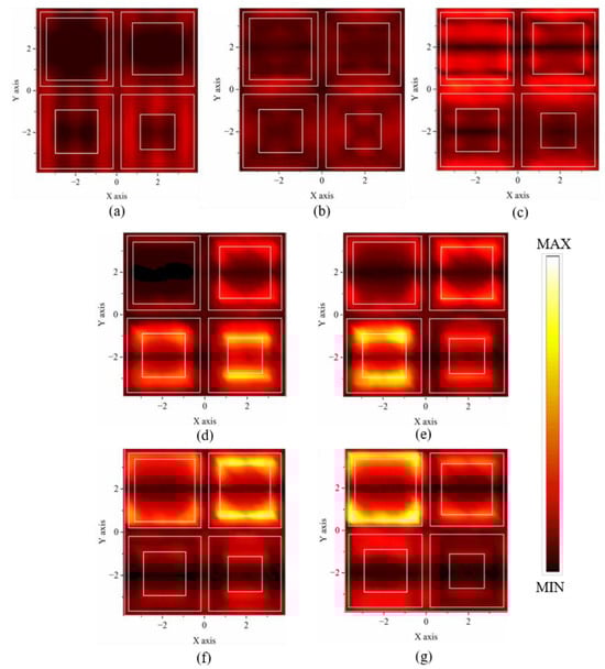 The electric field intensity profiles extracted in the XOY plane at seven resonance peaks at (a) λ1 = 1.57 μm, (b) λ2 = 3.68 μm, (c) λ3 = 4.64 μm, (d) λ4 = 8.39 μm, (e) λ5 = 9.22 μm, (f) λ6 = 10.61 μm and (g) λ7 = 11.94 μm. All electric field intensity profiles use the same reference scale.