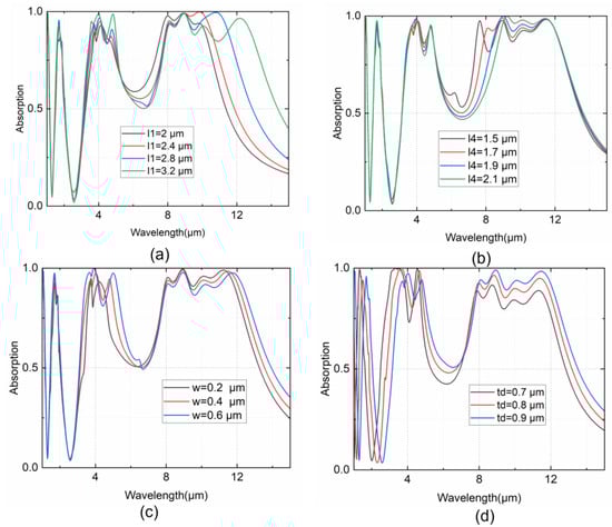 Based on the absorption mechanisms mentioned above, the scaling impact of the geometric dimensions to the absorption performance of our MSA is also investigated. As analyzed before, the resonance wavelength is in direct proportion to the size of the multipoles. And the thickness of dielectric layer directly determines the condition of phase matching of reflected waves for the FP mode. As shown in Figure 5a,b, the variation in the patch lengths only leads to the corresponding resonant wavelength shift in the LWIR range. For example, as shown in Figure 5b, when increasing the length l4 of the smallest patch, only the leftmost absorption peak in the LWIR region shows a significant redshift and eventually merges with the adjacent absorption peak. In contrast, other resonant peaks exhibit strong robustness against changes in the patch length, which also indicates that the four resonant peaks are independently attributed to the ED resonance of an individual Cr patch alone. Similarly, when increasing the width of the Cr grid, the increasing ED size of the grid results in a notably redshift of the second peaks in the MWIR region, as shown in Figure 5c. Notably, the redshift of λ7 in the LWIR region may also result from the coordinately enhanced coupling effect between the largest patch and its adjacent grids. Finally, the thickness of the CaF2 dielectric layer exhibits a significant impact on the absorption spectrum across the entire infrared region, as determined by the condition of impedance matching. However, only the resonant wavelengths of the first two peaks are prominently affected, indicating the dominant existence of a FP cavity mode. Spectral split is also observable in the first absorption peak of the MWIR region, which might be caused by the weak MD resonance of small patches.