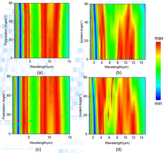 The absorption color maps obtained by different (a) polarization angles and (b) incident angles of TE incidence and (c) polarization angles and (d) incident angles of TM incidence.