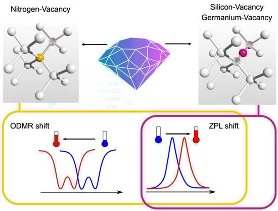 Crystal structures of diamond optically active defects: Nitrogen-, Silicon-, and Germanium-Vacancy centers. Temperature measurement protocols are based on the shift of optically detected magnetic resonance (ODMR) for the Nitrogen-Vacancy center only and on the shift of zero phonon line (ZPL) for all named defects.