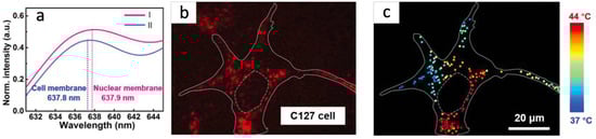 The most investigated and broadly used diamond color center is a Nitrogen-Vacancy (NV) defect consisting of a substitutional nitrogen atom next to a missed carbon—a vacancy. It can be found in two optically active charge states: neutral (NV0) and negative (NV−). At room temperature, their spectra demonstrate zero-phonon lines (ZPL) at 575 and 637 nm, respectively, with broad phonon sidebands [75]. Both optically active NV charge states can be used for temperature sensing. The detection method is based on observing the redshift of ZPL with a temperature increase [39,40,41,42]. Such a method is attractive due to the experimental simplicity since all operations and detection can be conducted purely optically. The ZPL shift happens linearly with temperature changes, simplifying temperature determination [39,40,41,42]. Many works focus on intracellular thermometry by detecting ZPL shift. As one example, the work of the group from Jinan University can be chosen (Figure 2a) [42]. Here, ND with NV centers were used for temperature sensing in different types of cells, particularly 4T1, C127, and HeLa cells. The temperature distribution was presented over a single C127 cell (Figure 2b). It demonstrates the temperature gradient and indicates that the nuclear close area is 5 °C warmer than the cell membrane region (Figure 2c).