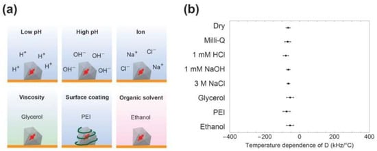 Proof of the insensitivity to the environment of the thermometry ability of ND was demonstrated in the following work [47]. A group of scientists from Japan tested ND with NV− centers for temperature sensing in different solvents, particularly in low-pH and high-pH solutions, high concentrations of Na+ and Cl− ions, glycerol with high viscosity, surface polymer coating, and ethanol as an organic solvent (Figure 3a). For all those environments, the temperature dependence of the ODMR shift (D) was measured (Figure 3b). The results clearly show that there is almost no influence from the surrounding solution parameters (ion composition, viscosity, etc.) on the temperature sensing ability of NV containing ND. It allows us to conclude that NDs can be used inside cells as a robust thermometer without the need to correct the artificial negative influence of the environment.