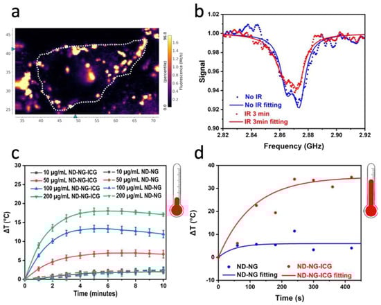 Fluorescent ND can also be used for drug delivery and cancer treatment, as was demonstrated by many groups [34,35,83]. The extreme photostability of ND emission makes them attractive systems for theranostics applications, where long-term imaging and high sensing ability are combined with therapeutic effects. For instance, one such utilization of ND with NV− centers was demonstrated by the group of T. Weil [84]. There, fluorescent NDs coated with nanogel shell (ND-NG) and additionally functionalized with indocyanine green molecules (ND-NG-ICG) were used to test cancer photo-treatment under infrared illumination with simultaneous intracellular thermometry (Figure 4a,b). Indocyanine green molecule is an approved imaging agent for different clinical applications [85]. Its ability to be used for cancer diagnosis and treatment is currently being investigated [85]. For such an application, the determination of optimal concentrations of molecules and light explosion for effective cancer phototherapy is essential. The ND-based thermometer system demonstrated in [84] allows us to evaluate the saturation temperature for different ND concentrations and, as a result, of indocyanine green in water (Figure 4c) and inside living cells (Figure 4d). The demonstrated measurements monitored the local temperature at the start of cell apoptosis, which is essential for improving phototherapy protocols.