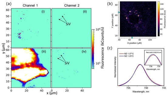 (a) Dual-confocal imaging of HeLa cells with ND with SiV: channel 1 collects all fluorescent >560 nm, and channel 2 is selective for SiV emission. (i) and (ii)—cells with ND only, (iii) and (iv)—cells additionally marked with membrane dye. (b) Confocal imaging of HeLa cells incubated with ND with SiV centers. (c) Thermometry by the redshift of SiV ZPL measured inside the living cell, where the incubator stabilized two temperatures. Data from [53].