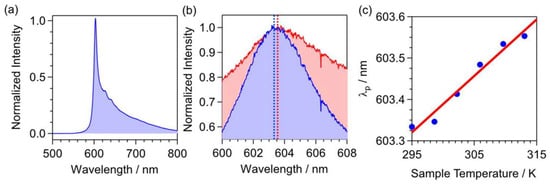 (a) Photoluminescence spectrum of GeV in detonation ND at a temperature of 22.0 °C. (b) The peak of the photoluminescence spectra of GeV centers was obtained at 22.0 °C (blue-filled) and 39.9 °C (red-filled). (c) The shift of the ZPL position depends on the temperature. Data from [57].