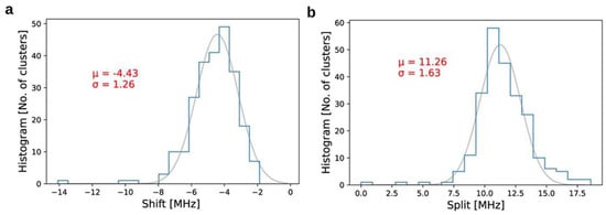 (a) The distribution of the ODMR shift for ND over 247 nanocrystals, where the axial strain is determined as ~4.43 MHz. (b) The distribution of the ODMR split for ND over 247 nanocrystals with the mean value of transverse strain at 11.26 MHz. Data from [95].