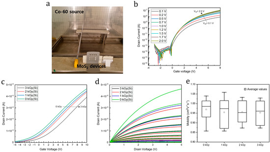 (a) Gamma irradiation test setup for MoS2 buried local back-gate transistors. Co-60 was used as the gamma source. (b) Id–Vg characteristics for the non-irradiated MoS2 buried local back-gate transistors. (c) Id–Vg characteristics, (d) Id–Vd characteristics, and (e) field-effect mobility of the MoS2 buried local back-gate transistors for various gamma irradiation doses.