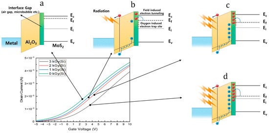 Although research on the effects of gamma radiation at the MoS2 transistor level is still in its initial stages with several technical challenges still to be addressed, experiments aimed at identifying the effects of gamma radiation on MoS2-based transistors and films have been conducted. For example, Isherwood et al. reported that high-dose gamma irradiation causes radiation damage, such as the radiolytic oxidation, doping, and etching of MoS2 flake films, which act as defect states within the MoS2 band gap, thereby degrading the device performance [15]. In addition, Vogl et al. reported the radiation tolerance of TMD-based devices using various irradiation sources, including gamma rays, protons, and electrons. The results indicated negligible variations in the current–voltage characteristics and photoluminescence intensity of mechanically exfoliated MoS2 devices that were subjected to gamma radiation [16]. Furthermore, Ozden et al. reported that the gamma radiation of few-layered MoS2 flakes created sulfur vacancies in the MoS2 structure, which were transformed into molybdenum oxide [17]. Moreover, Chen et al. performed gamma irradiation experiments on MoS2 transistors with solid polymer electrolyte gate dielectrics. After being subjected to gamma irradiation, the devices performed well; however, transfer curve changes and threshold voltage shifts were observed owing to the radiation-induced trapped electrons near the interface of the solid polymer electrolyte and MoS2 [18].