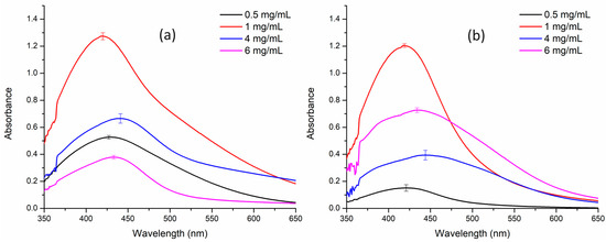 Previously, several studies have reported green synthesis of nanoparticles using crude extracts of the rhizomes and roots, but these investigations lacked critical parameters, such as light conditions, temperature, and pH, which are essential for optimization of NP synthesis [12]. In this pioneering study, we have successfully demonstrated synthesis of AgNPs from BC leaf extract under various light conditions, a novel approach that expands our understanding of this plant’s potential applications and opens new avenues for nanoparticle research. Initially, concentration-dependent optimization of both AE and ME against 1 mM AgNO3 was performed. It was observed that the optimum concentration of both extracts was 1 mg mL−1 (Figure 1). Following the concentration optimization, the influence of light on nanoparticle synthesis was demonstrated, the outcome of which was contrasting for AE and ME (Figure 2).