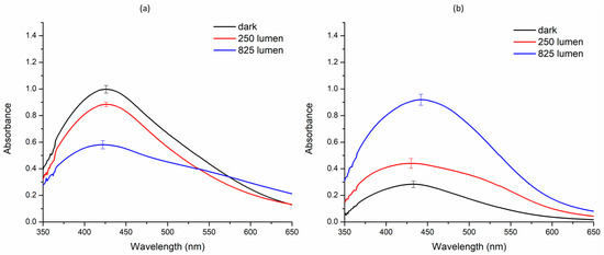 Effect of various intensities of white light-emitting diode on the green synthesis of silver nanoparticles. (a) Aqueous extract; (b) methanol extract.