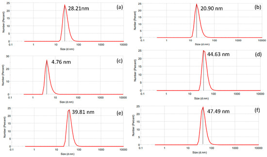 Particle size analysis of aqueous and methanol extracts by dynamic light scattering technique. (a) Aqueous extract under darkness; (b) methanol extract under darkness; (c) aqueous extract under 250 lms; (d) methanol extract under 250 lms; (e) aqueous extract under 825 lms; (f) methanol extract under 825 lms.