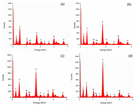 EDX spectroscopy analysis revealed the percentage of a diverse range of elements in the nanoparticle samples. Notably, silver (Ag) was consistently present in the highest abundance across all cases (Table 5). Additionally, other elements, such as platinum (Pt), magnesium (Mg), calcium (Ca), and chlorine (Cl), were also detected, albeit in smaller quantities. The presence of these elements suggests a complex composition of the nanoparticles, with Ag being the dominant component (Figure 5).
