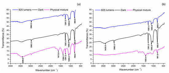 A comparative analysis of the FTIR spectra showed that AE-based nanoparticles exhibited consistent peaks at wavenumbers 1261, 1095, and 800.9 cm⁻1 across all light conditions, including the physical mixture. In contrast, ME-based nanoparticles displayed a common peak only at 800.7 cm⁻1, indicating a difference in bonding patterns between the two types of nanoparticles (Table 6) [38]. These findings suggest that the bonding arrangements in the nanoparticles are influenced by the extract used and the light conditions employed during synthesis.