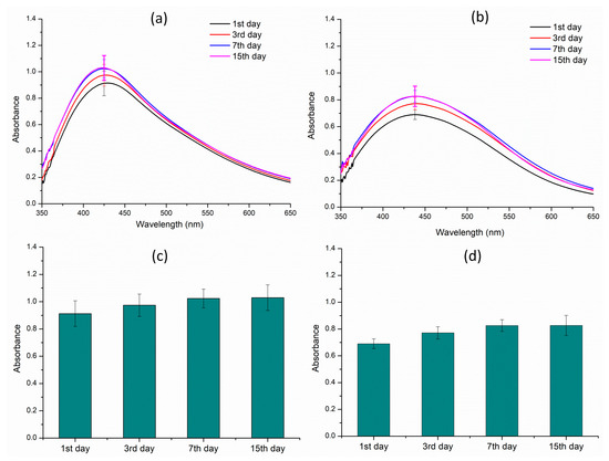Stability studies of the silver nanoparticles over a period of 15 days. (a) Aqueous extract; (b) methanol extract; (c) λmax of the aqueous extract; and (d) λmax of the methanol extract.