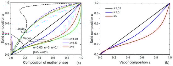 In the limit , corresponding to high levels of supersaturation due to large material inputs from vapor, we simply have , and the liquid–solid distribution becomes purely kinetic. At , the vapor–solid distribution given by Equation (6) is reduced to
