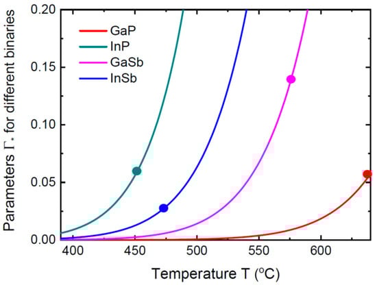 Temperature-dependent parameters for GaP, InP, GaSb and InSb binaries. Circles correspond to the maximum temperatures for the typical VLS growths of GaPxAs1−x, InPxAs1−x, GaSbxAs1−x and InSbxAs1−x NWs. For GaPxAs1−x, InPxAs1−x and InSbxAs1−x systems, the values of remain smaller than ~0.05 in the interesting temperature windows, which fully justifies the independence of the stationary NW compositions on the liquid state. For the GaSbxAs1−x system, the parameter is negligibly small for temperatures below 550 °C, but increases to more than 0.2 at 590 °C. Further increases in temperature lead to the liquid-dependent compositional trends.